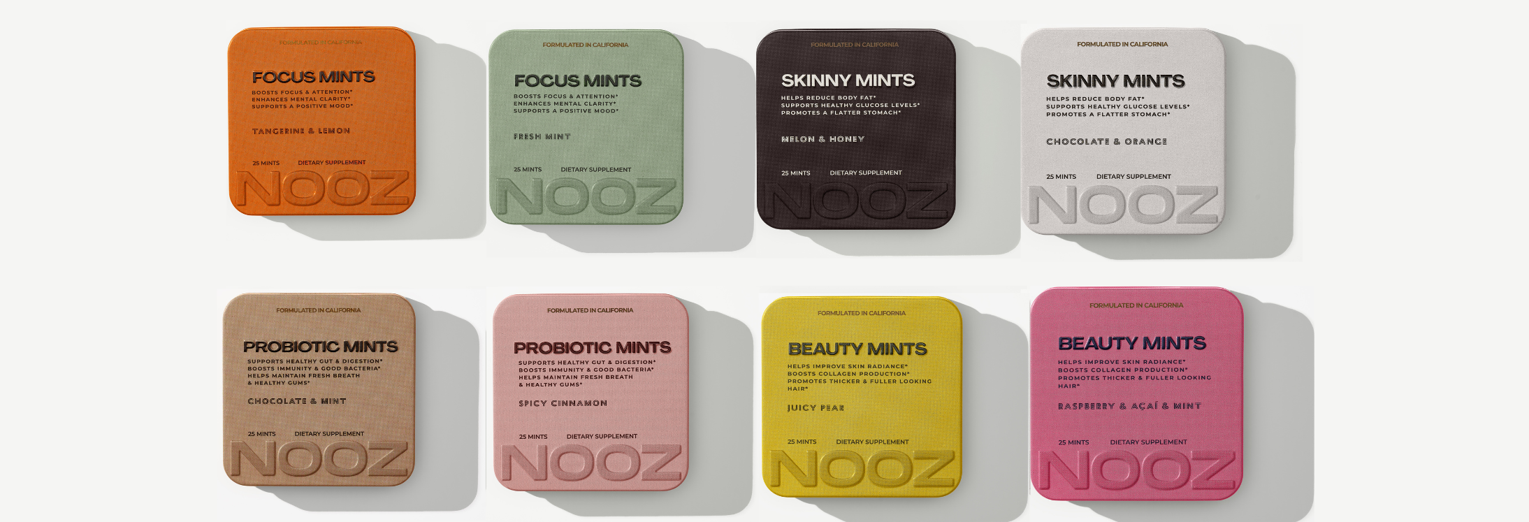 NOOZ is the first functional mints brand built by women, for women with our needs front and center (but guys are welcome to savor the innovation too!). Our mints are loaded with vitamins, natural extracts, and benefits for brain health, gut & weight health, hair, skin, and nails.